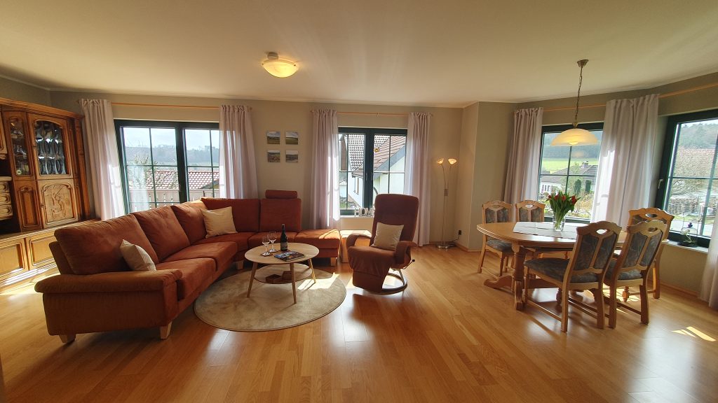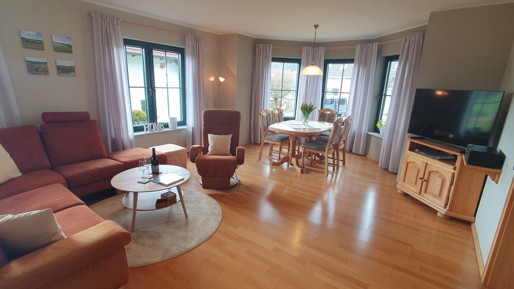 Die freundlich und gemütlich eingerichtete Ferienwohnung (Nichtraucherwohnung) liegt im Erdgeschoss des Hauses und hat eine Größe von ca. 103 qm. Bis zu 4 Erwachsene und ein Kleinkind können hier ihren Urlaub genießen. Die Ferienwohnung ist barrierefrei.